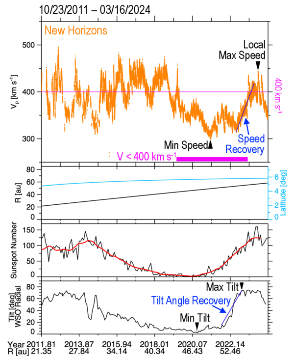 The long slow wind interval observed by NH in the outer heliospheric ecliptic occurred when slow solar wind was emitted by the coronal streamers in the ecliptic. The slow interval marked in pink began at solar minimum when the current sheet tilt angle was low, confining the coronal streamers that emit slow solar wind to low latitudes. The bottom panels are time series plots of the solar wind speed along the NH trajectory (top panel), the radial distance to the Sun from NH and latitude of NH (second panel), the monthly and 13 month smoothed sunspot number (third panel), and the current sheet tilt angle (bottom panel). The steep tilt angle recovery and speed recovery are denoted in blue.