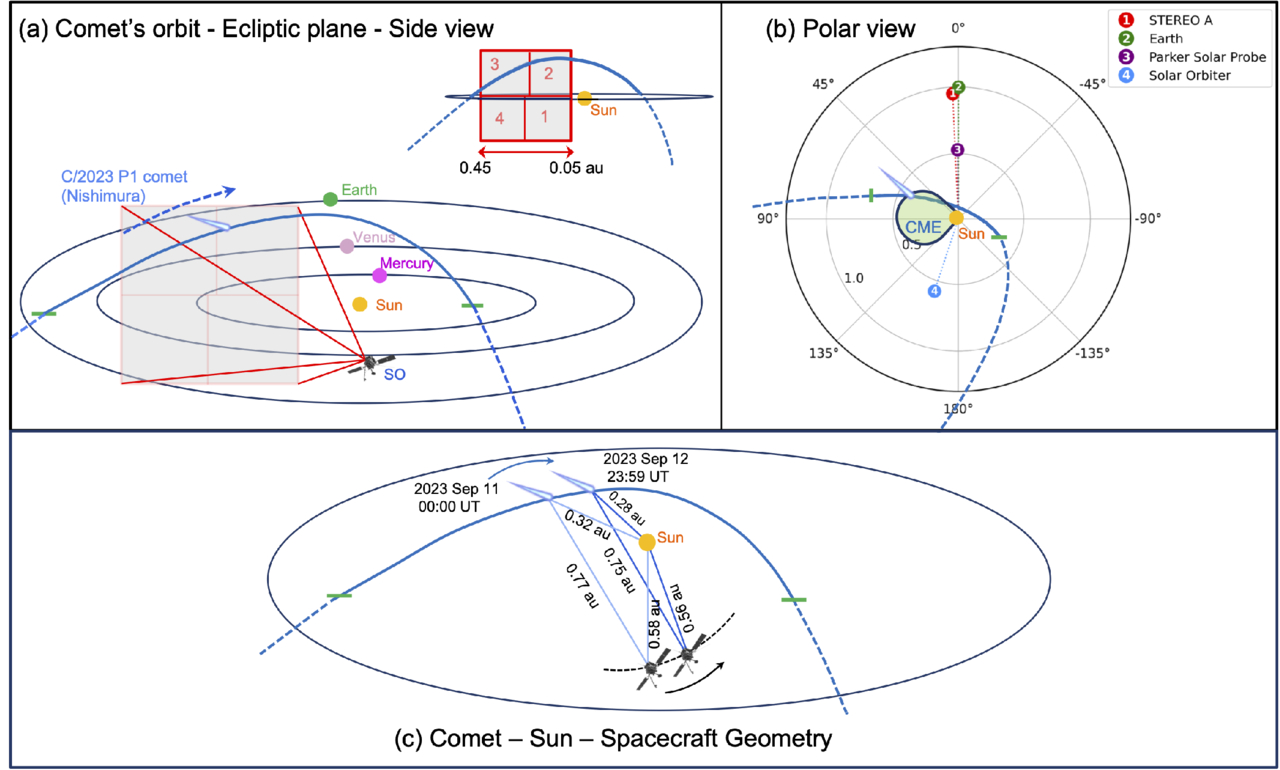 Trajectory of C/2023 P1 comet, with the respective positions of Solar Orbiter, the nearby planets, and other spacecraft. (a) Side view of the comet location relative to the ecliptic plane on 2023 September 11. The blue dashed arrow indicates the direction of the comet trajectory. The path of the comet above the ecliptic plane is shown in solid blue and below in dashed blue. An inset shows the SoloHI FOV (gray shaded region enclosed by the red outline) on that day. (b) The ecliptic plane and the comet’s path as viewed from above the solar north pole. The green shaded region shows the extent of the CME associated with the TDE under study and illustrates the geometry of CME–comet interaction. The polar map in the background layer is produced using the Solar-MACH (J. Gieseler et al. 2023). (c) Comet–Sun–Solar Orbiter geometry, and the comet and Orbiter trajectory during the analysis period of 2023 September 11, 00:00 UT to 12, 23:59 UT. The orbital ephemerides are obtained from the JPL Horizons page. This schematic renders the simplified CME–comet geometry and is not drawn to scale.
