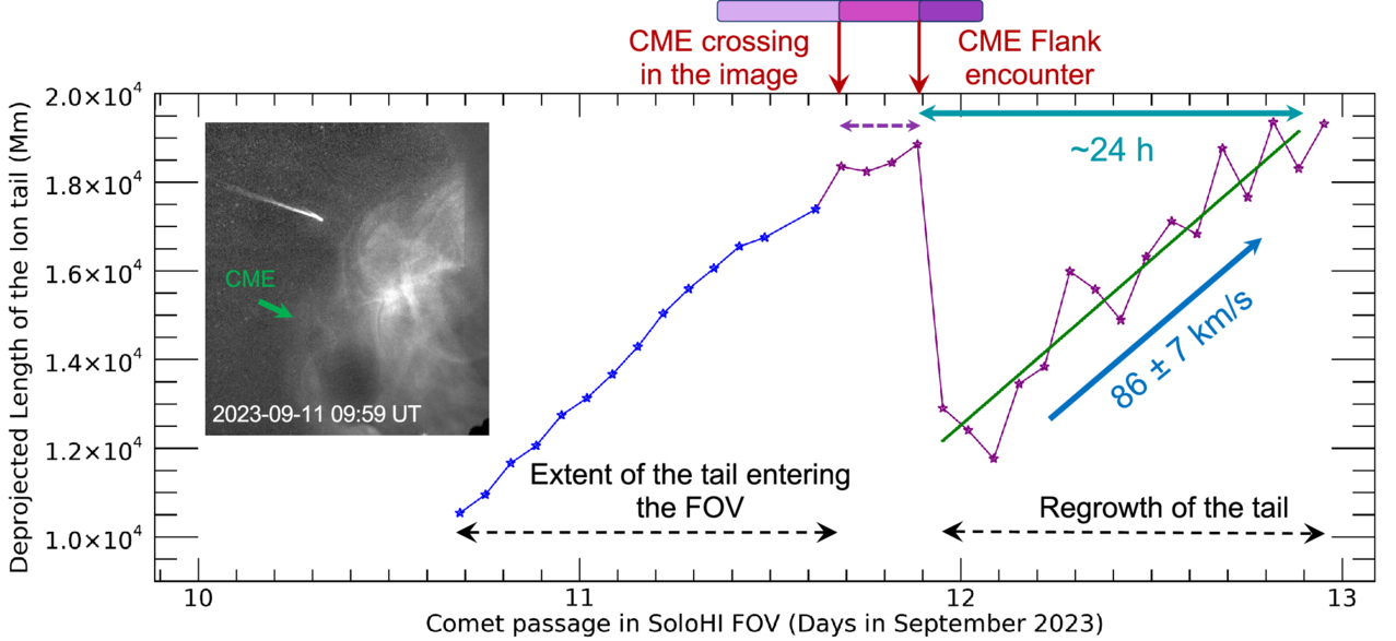 Rate of regrowth of the ion tail after the disconnection event. The inset figure shows the comet and the CME as they propagate in the SoloHI tile 2 FOV. The abrupt decrease in tail length near 19:00 UT on 2023 September 11 indicates the tail disconnection, following the CME crossing and flank encounter (red arrows on the top). The extent of the comet’s tail entering the FOV is shown in blue symbols in the plot. The tail remains fully within the FOV for four consecutive frames (marked by the purple arrow), after which the disconnection and regrowth are observed. The purple overbar marks the CME’s passage duration through the SoloHI FOV, CME’s entry (light purple), the leading-edge passage in projection before the comet–CME interaction (medium), and the interval after the comet crosses the CME flank (dark). The growth rate is determined from the slope of the linear fit indicated by the green line.