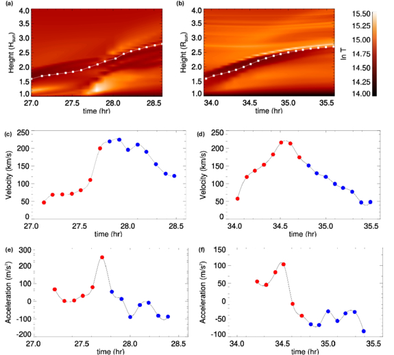 (a) Height–time profile of the core of the flux rope before and after the first eruption at t = 27.9 hr. The height is calculated by tracking the dark region (flux rope) in the central meridional plane. (b) Same as (a), but for the second eruption at t = 34.7 hr. Time evolution of velocity, (c)–(d), and acceleration, (e)–(f), for both eruptions in the simulation. The red (blue) circles are used to represent simulation data before (after) the eruption.