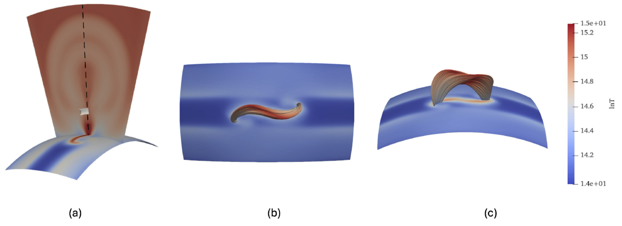 Identification of the CS and field lines of the flux rope from different viewing angles. The CS (in white) traced from the temperature isosurface with a value ﹩{\mathrm{log}}_{10}T=6.6﹩ is shown in panel (a). The height of the CS isosurface (white) from the lower boundary is about 1.4R⊙. The field lines passing through such sheets give the RC flux. The sigmoid field lines are shown in panels (b) and (c). The time in all these panels is at t = 27.32 hr.