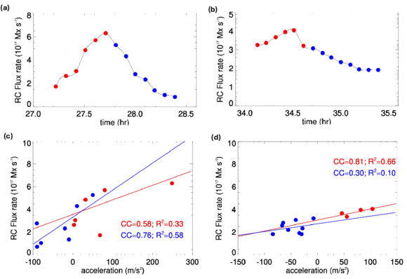 Time evolution of RC rate (a)–(b). The RC flux is calculated by the magnetic flux passing through the footpoints of the field lines as well as through the CS shown in Figure 6(a). The red (blue) circles are used to represent simulation data before (after) the eruption. The smoothing is done by cubic spline. (c) CME RC rate vs acceleration plot for the first eruption. The red (blue) line is the linear fit to the points before (after) the eruption, respectively. (d) Same as (c), but for the second eruption.