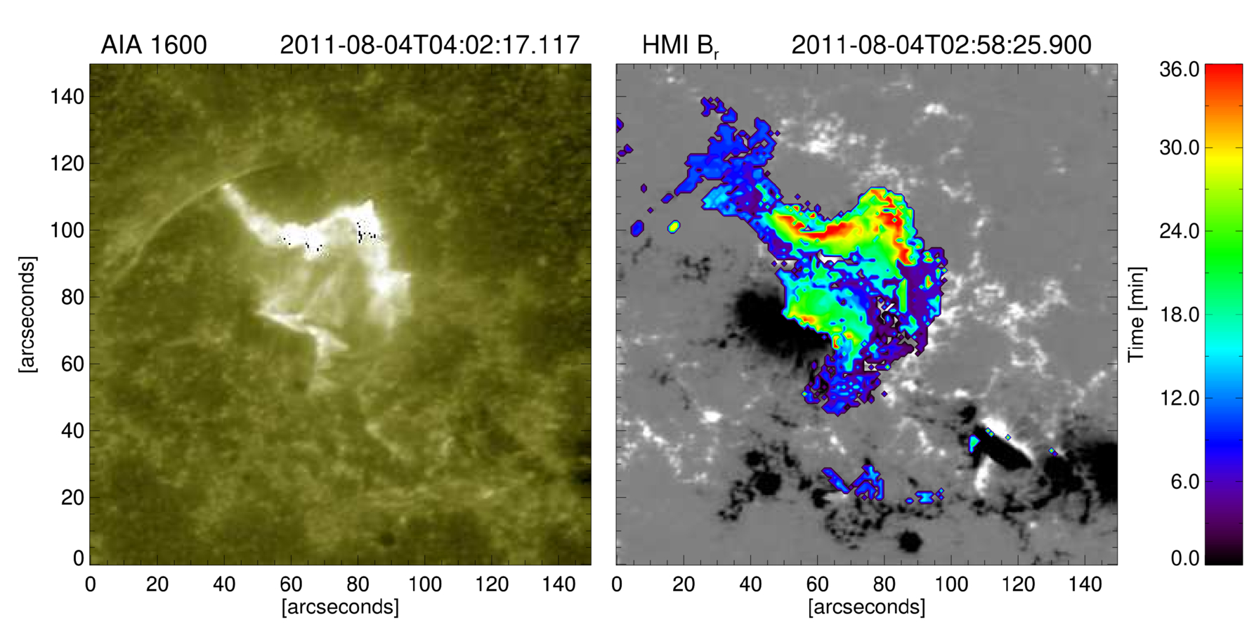 Left panel: flare-associated brightening observed in the AIA 1600 Å channel during the flare that occurred in AR 11261. Right panel: the associated HMI Br magnetic field (gray color scale with saturation value ±500 Gauss) and the temporal evolution of the flare ribbons from 03:41 to 04:17 UT on 2011 August 04.