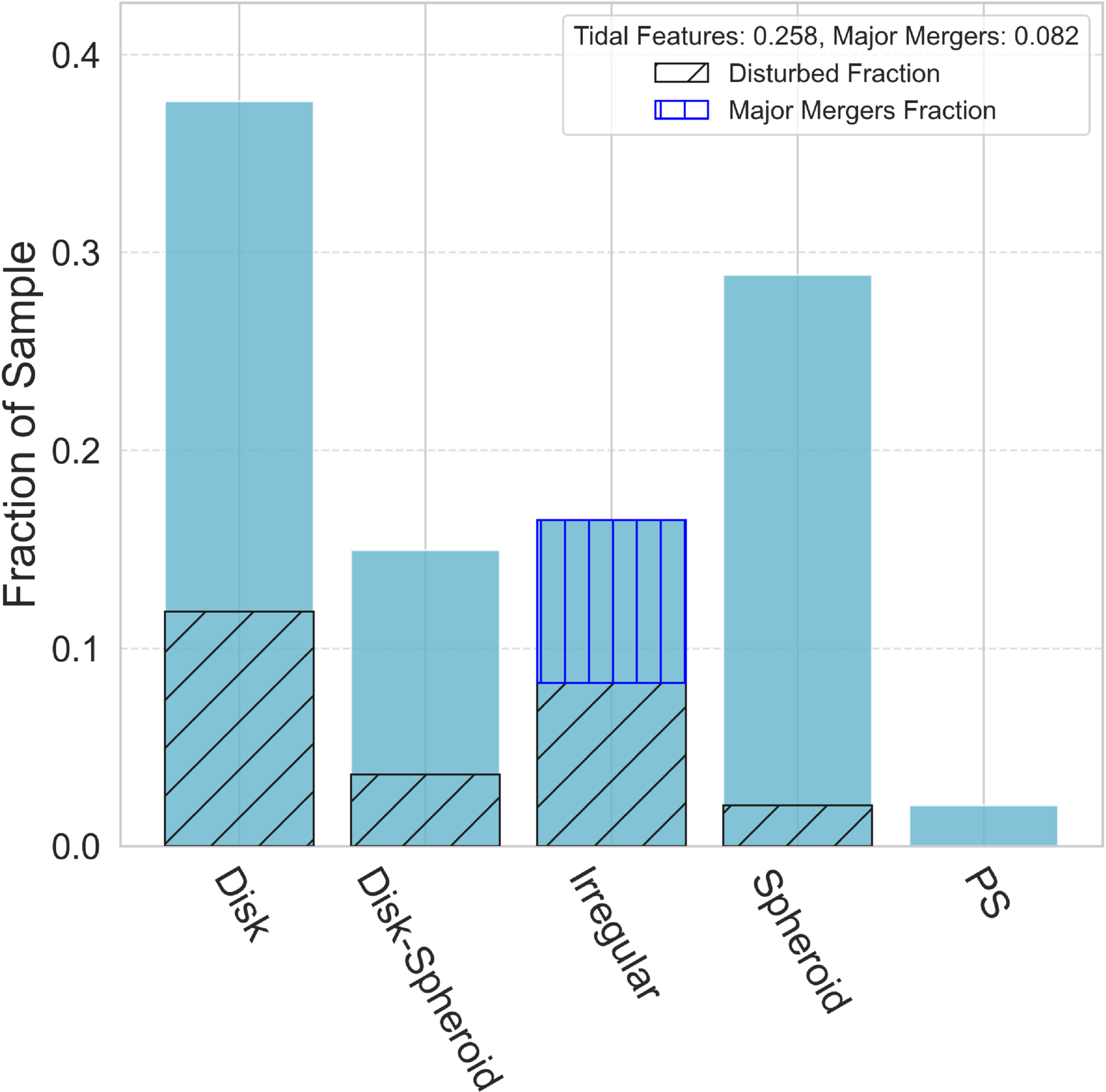 Morphologies for all 194 sample galaxies. disk-dominated sources (disk or disk-spheroid) comprise over half (∼52%) of the galaxies in our sample; irregulars comprise ∼16.5%, spheroids ∼29.3%, and PSs ∼2%. Ring galaxies are not included due to the small number in our sample.