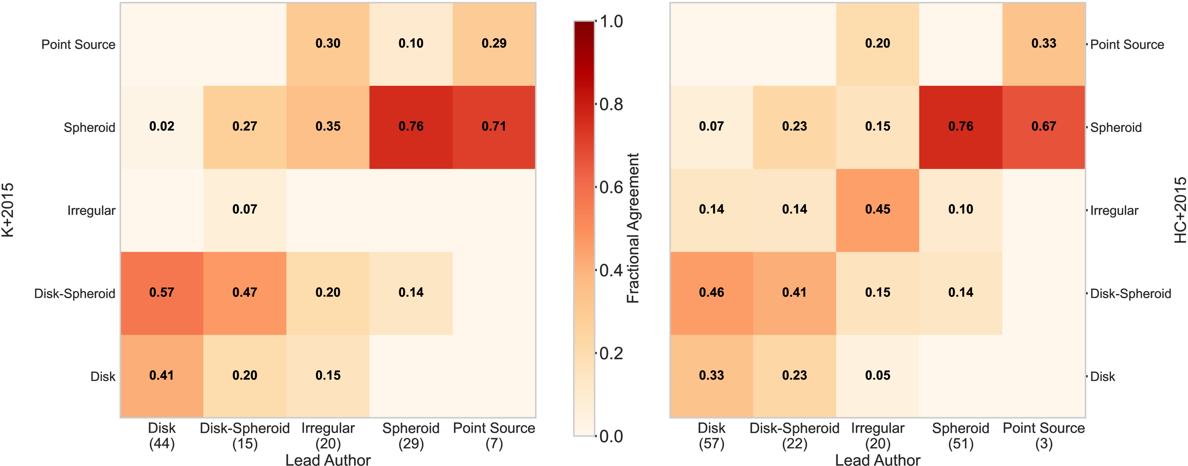 A 2D histogram comparing visual-like morphological classifications from (1) M. Huertas-Company et al. (2015) and (2) J. S. Kartaltepe et al. (2015) with visual classifications from the lead author. Note: 67/194 of the lead author’s classifications are from JWST, with the remainder from HST. Both classifiers agree very well for bulge-dominated (spheroid and PS) galaxies. We generally agree whether a source is disk-dominated, but do not agree specifically about whether a spheroidal or halo component is prominent beside the disk. This is not surprising, since the disk-spheroid category is the most “subject to interpretation” category within our classification scheme. Note also that irregulars show low agreement (45% with M. Huertas-Company et al. 2015, 0% with J. S. Kartaltepe et al. 2015). There are several reasons for this: irregular galaxies constitute a wide range of morphological properties from small with large asymmetries to those undergoing major mergers. Irregular indicators such as tidal streams are also faint, and if they are not sought out, they can remain hidden from studies that do not explicitly look for them. We note that 100% of this work’s visually classified irregular galaxies show evidence of disturbances or major mergers, improving our confidence in our classification of these sources.