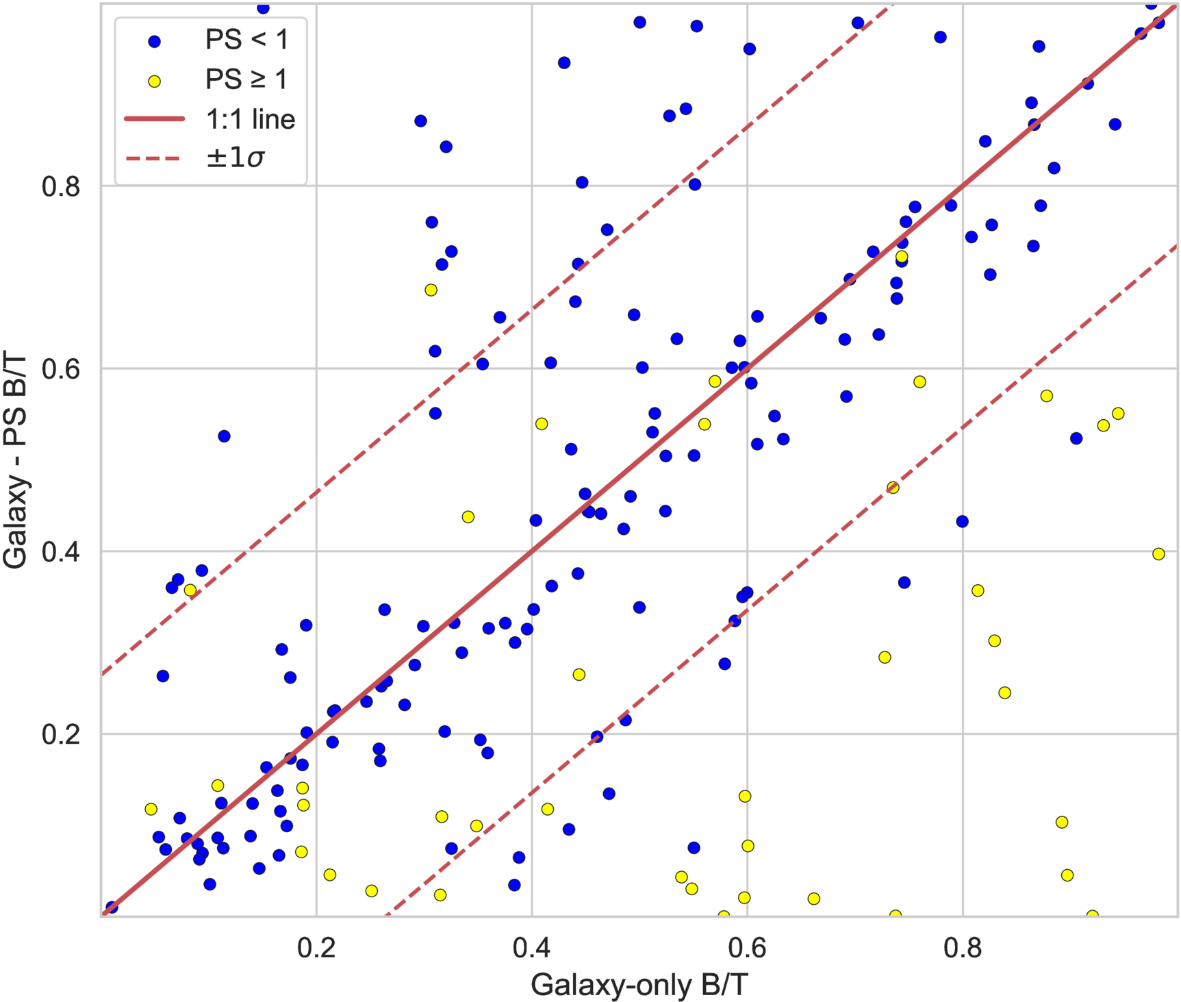 Galaxy-only B/T ratio versus galaxy minus PS B/T ratio for 187 GOODS X-ray AGN colored by the ratio of light in the PS to the host galaxy (PS ratio). Note that the majority of fits with PS ratio > 1 show large diversions between the fit results. In some of these cases, the two-component only fit performs comparably to those with a PS subtracted, but for many sources with a large PS contribution, the B/T ratio appears to be overestimated if a PS is not subtracted. Sources above the +1σ line show, except for three galaxies, no improvement and even some evidence for overfitting if a PS is included.