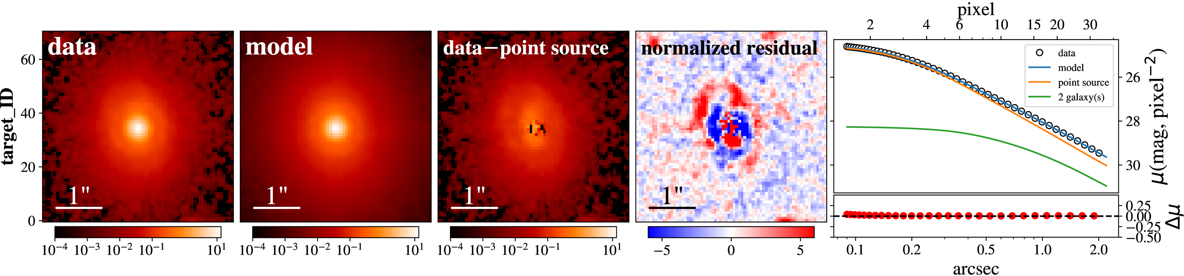 Example HST F125W galight results for GOODS-N ID 459 (visual classification: Irregular). The left panel shows the raw F125W data. The second panel shows the model of the source created by galight using the best-fit PSF. The third shows the data with a PS subtracted away, revealing the galaxy underneath. The fourth shows a normalized residual after subtracting the model from the data. The fifth shows the azimuthally averaged radial profiles for (a) the observed data, (b) the full galight model, which is the sum of (c) the PS and (d) bulge and disk component radial profiles (listed as “galaxy(s)” in the figure) showing that the model fits the data quite well, except for an excess from the underlying host galaxy. There is strong evidence for a spiral or ring-like structure under the PS, though the spiral arms are irregular and asymmetric.