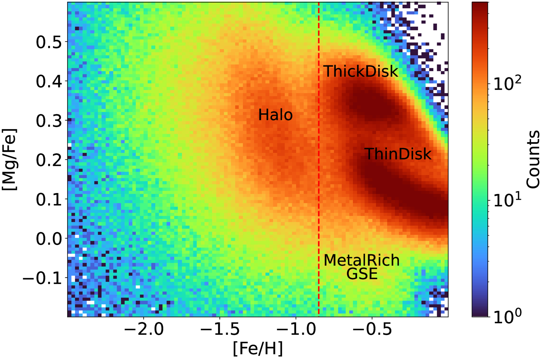 DESI DR2 giants in [Fe/H]–[Mg/Fe] space from the RVJ pipeline. The giants are selected from the MAIN-BRIGHT program. Halo stars are defined by [Fe/H] < –0.85 (vertical red dashed line).