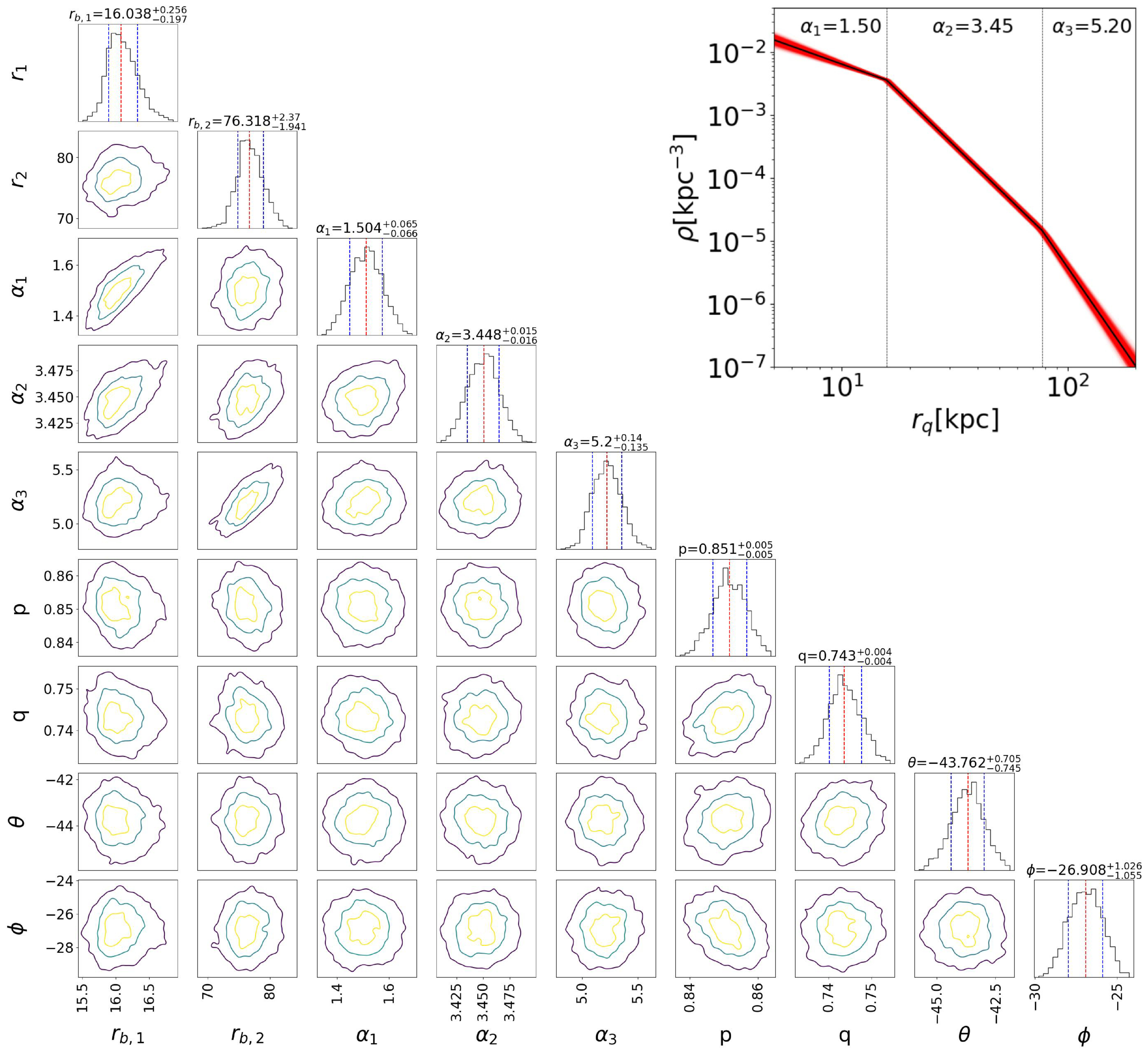 Posterior contours for different combinations of nine parameters of the triple power-law model. Red and blue dashed lines indicate 50th, 16th, and 84th percentiles. The meanings of different model parameters can be found in Section 3.2. The yellow, light-blue, and dark-blue contours represent the 30%, 1σ, and 2σ regions of the MCMC post-burn distributions, respectively. The black line in the inset panel shows the selection-effect-free best-fit model radial density profile (renormalized to unity), with the red shaded region representing the 1σ model uncertainty, and two vertical black dashed lines mark two break radii.