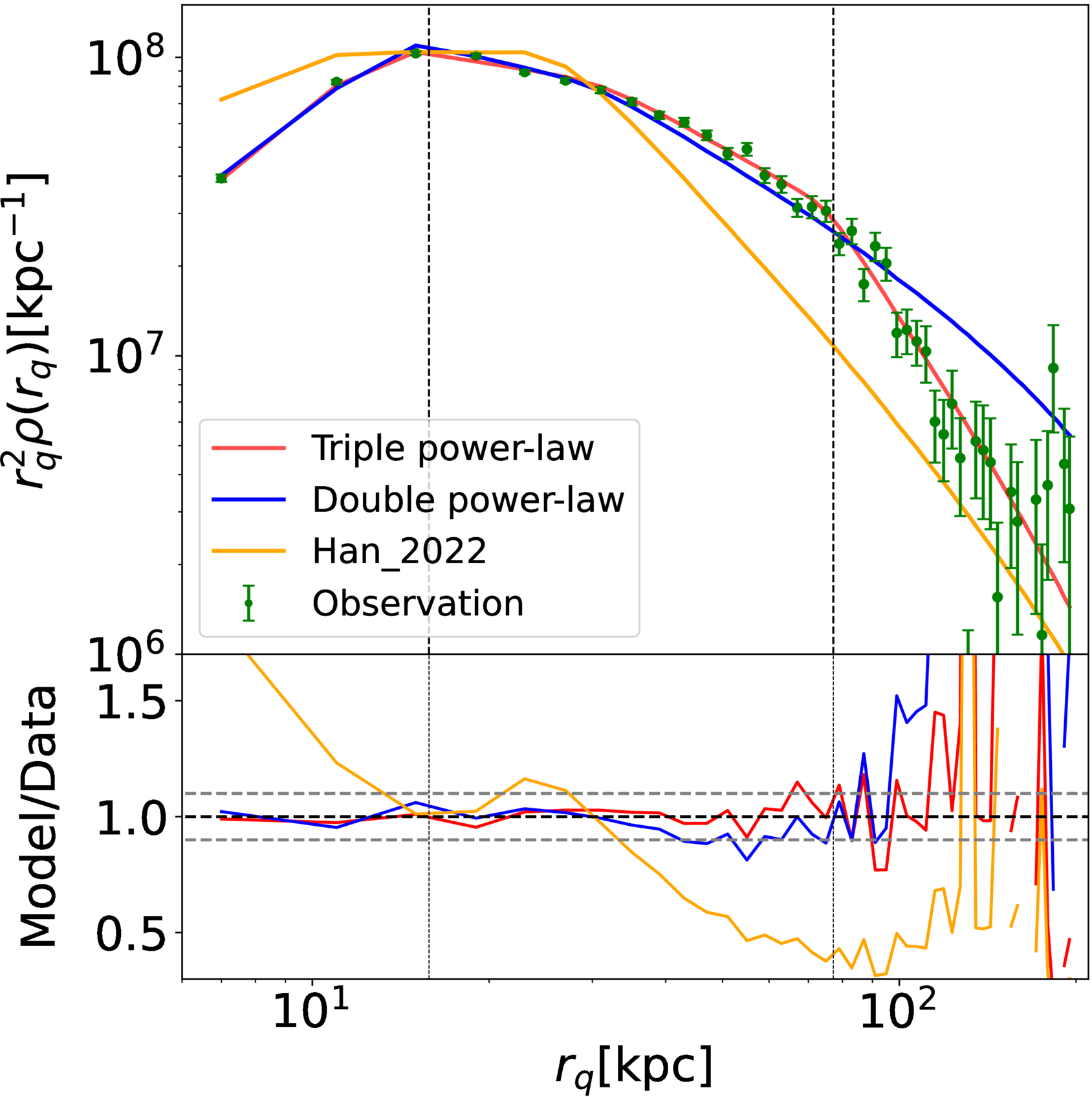 The top panel shows with green circles the observed stellar density multiplied by ﹩{r}_{q}^{2}﹩ as a function of flattened radius, rq, compared to the best-fit triple power-law model (red solid line) and double power-law model (blue solid line). Error bars represent the 1σ uncertainties computed from 100 bootstrap subsamples of our K giants. Here the best-fit triple power-law model in this work (red solid line), that in J. J. Han et al. (2022; orange solid line), and the double power-law model (blue solid line) have been convolved with the angular and radial selection functions to have a fair direct comparison with the data (see Section 3.1). Two vertical black dotted lines in both the top and bottom panels represent the two break radii, rb,1 and rb,2, respectively. Two horizontal dashed gray lines in the bottom panels represent 10% regions of the model-predicted density over observed density, with the black dashed horizontal line marking y = 1. Both triple power-law and double power-law models fit the stellar halo within 70 kpc well, but the double power-law model shows a worse match of the outer stellar halo beyond ∼70 kpc.