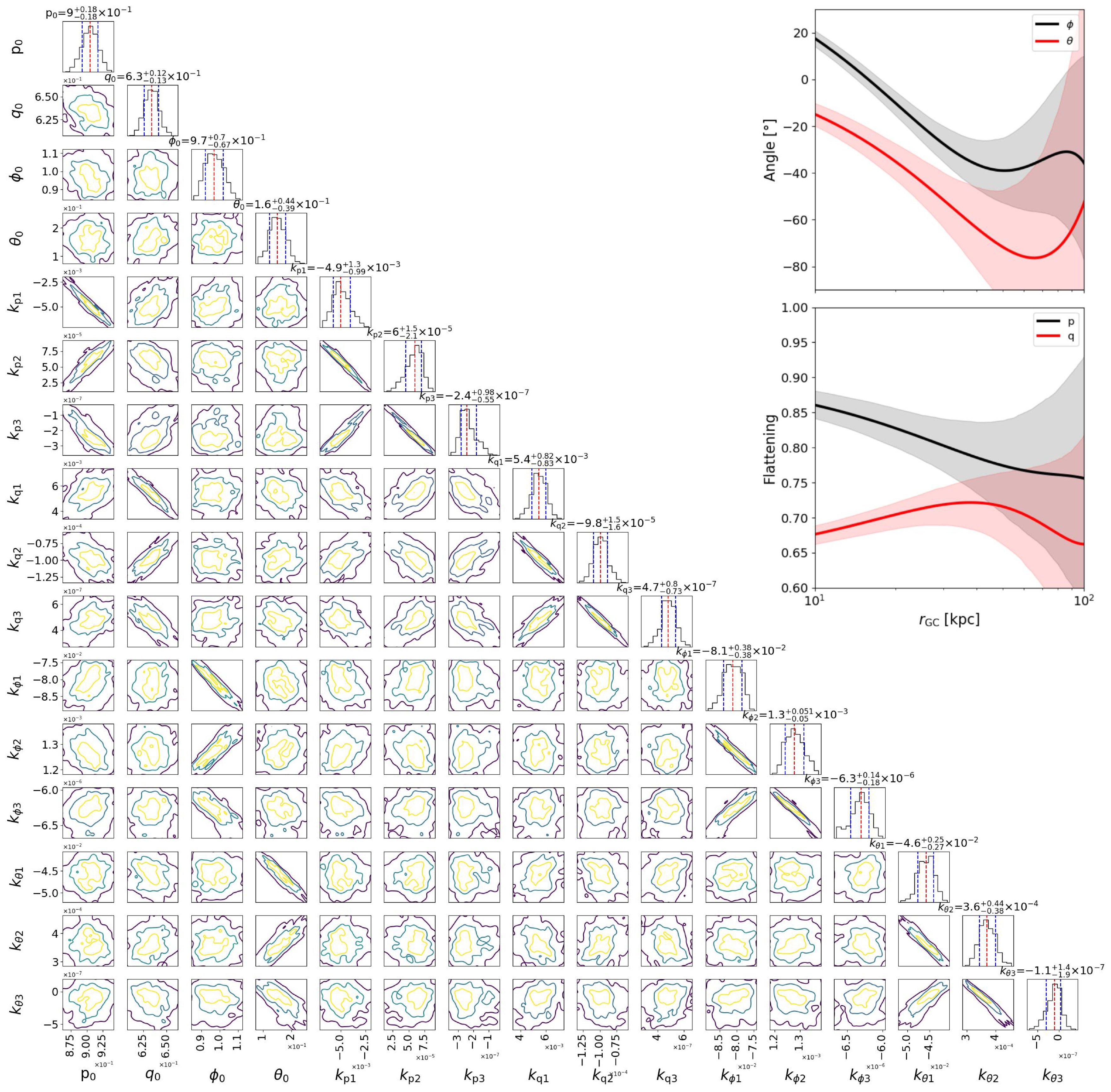 The posterior contours of 16 model parameters of the variable model. Red dashed lines and blue dashed lines indicate 50th, 16th, and 84th percentiles. The meanings of different model parameters can be found in Section 3.2. The yellow, light-blue, and dark-blue contours represent the 30%, 1σ, and 2σ regions of the MCMC post-burn distributions, respectively. The two panels in the upper right corner present the dependence of the rotation angles ϕ, θ and flattenings p, q on rGC. The thick lines are the predictions from the best-fit model, and the shaded regions present the 1σ uncertainty of the variable model.