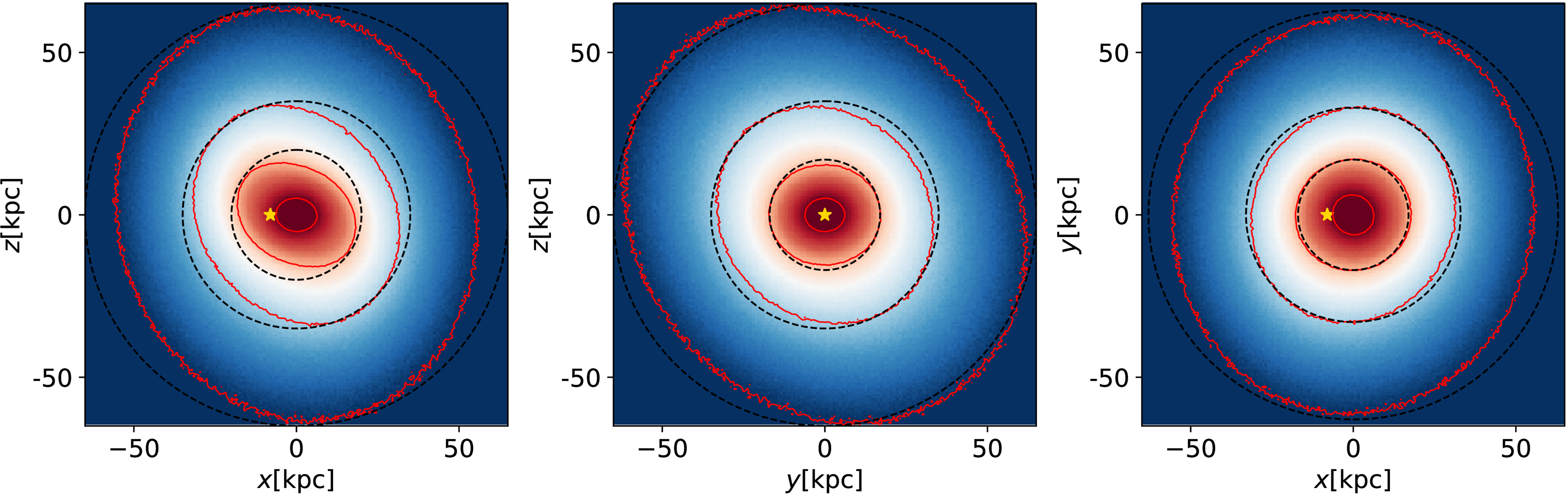 The density distribution of the best-fit variable model in the x–z (y = 0), y–z (x = 0), and x–y (z = 0) slices. Here x, y, z are standard Galactocentric Cartesian coordinates. The red solid lines are isodensity contours, with the density for each outer contour decreased by a factor of 10 compared with the previous inner one. The black dashed lines indicate reference circles. The yellow pentagram denotes the location of the Sun.