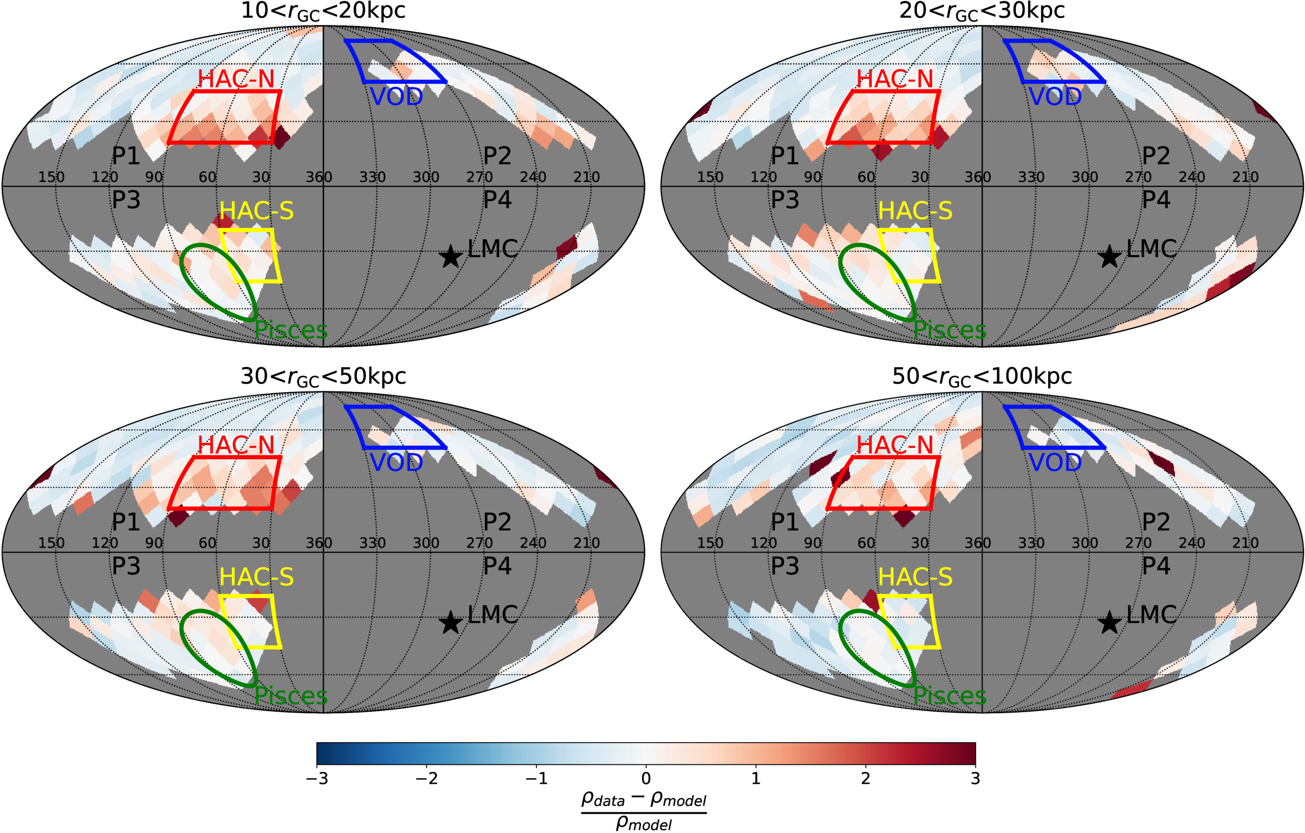Angular residuals between data and the best-fit variable model in Mollweide projection in Galactic coordinates. Here selection effects have been corrected. Four panels show the residuals in four different galactocentric distance bins of 10 kpc < rGC < 20 kpc, 20 kpc < rGC < 30 kpc, 30 kpc < rGC < 50 kpc, and 50 kpc < rGC (see the text on top of each panel). The black pentagram in each panel marks the current location of the LMC. The HAC-S (yellow), HAC-N (red), Pisces (green), and VOD (blue) regions are enclosed by the corresponding colored solid lines. The definition of these regions can be found in Table 1.