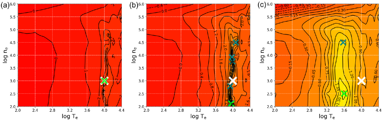 Objective function surface topography under increasing line measurement uncertainty, visualized as ﹩-\mathrm{log}\,{\rm{Var}}\,\left(\{c{({\rm{H}}\beta )}_{i}\}\right)﹩ (Equation (9)). All panels show the location of the input (white cross), the optimized solution (light green cross), and significant local maxima (dark green crosses; >60% of the global maximum). (a) No error: sharp global maximum (value of 19.5) at the true input parameters. (b) 0.1% noise: peak diminished (value of 9.5) and displaced to smaller ﹩\mathrm{log}\,{n}_{{\rm{e}}}﹩ along a ridge of local maxima. (c) 1% noise: surface distorted and flattened, with a biased solution (value of 2.4) offset in both ﹩\mathrm{log}\,{n}_{{\rm{e}}}﹩ and ﹩\mathrm{log}\,{T}_{{\rm{e}}}﹩. The height of the global maximum is ﹩\,\rm{value}\,=-\mathrm{log}\,{\rm{Var}}﹩, or equivalently Var ≈ 10−value, indicating the relative sharpness/dullness of these surfaces.