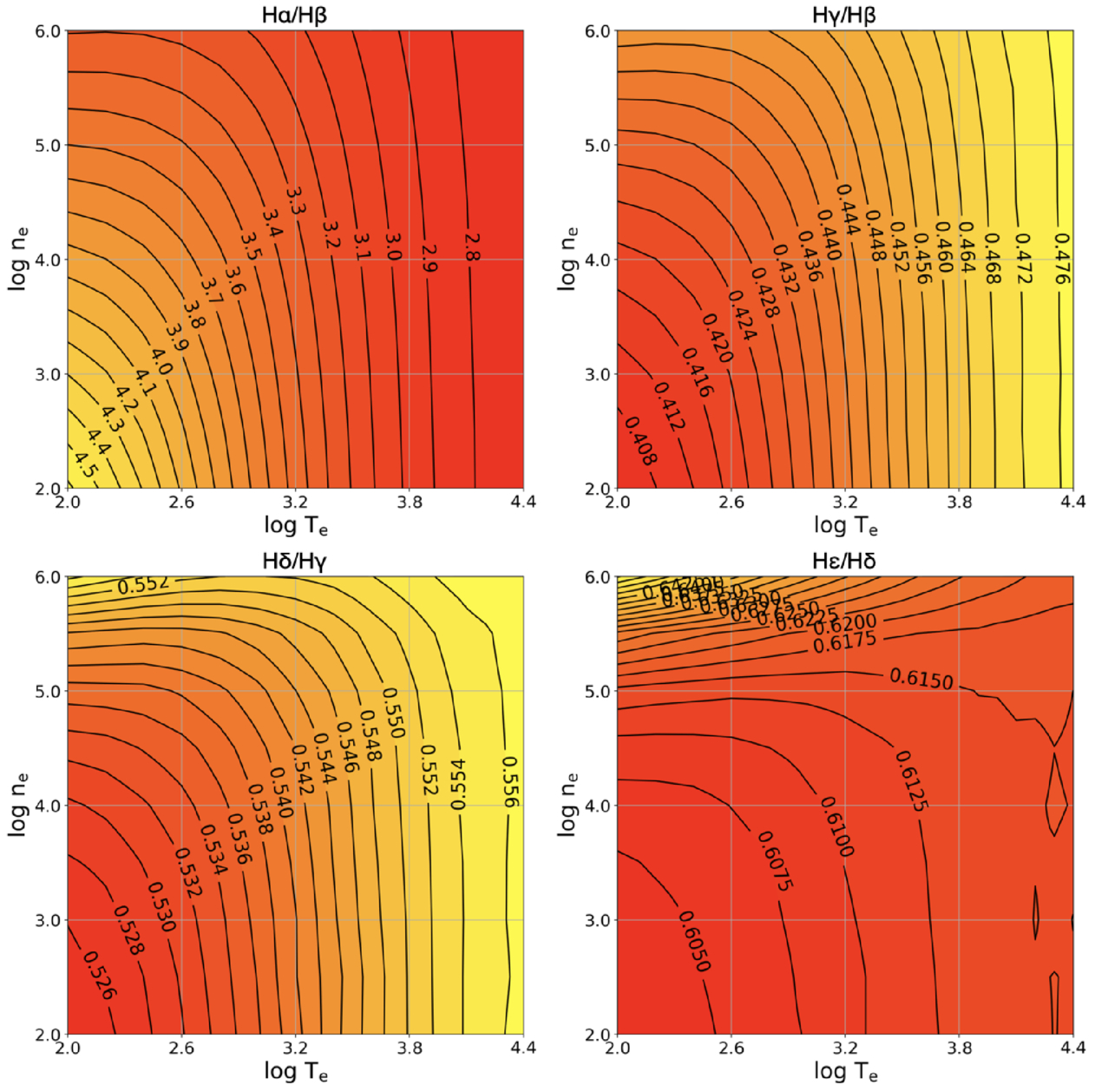 Contour maps of representative Balmer-emissivity-ratio surfaces constructed from Hα/Hβ, Hγ/Hβ, Hδ/Hγ, and Hϵ/Hδ, illustrating the qualitatively similar gradient structure in the ﹩\mathrm{log}\,{n}_{{\rm{e}}}﹩–﹩\mathrm{log}\,{T}_{{\rm{e}}}﹩ plane across different Balmer-line normalizations. The ratios are computed from interpolated Case B emissivities, plotted on a common color scale, and exhibit systematic variations of gradients, particularly along the ﹩\mathrm{log}\,{T}_{{\rm{e}}}﹩ direction in the low-﹩\mathrm{log}\,{n}_{{\rm{e}}}﹩ regime and along the ﹩\mathrm{log}\,{n}_{{\rm{e}}}﹩ direction in the low-﹩\mathrm{log}\,{T}_{{\rm{e}}}﹩ regime.