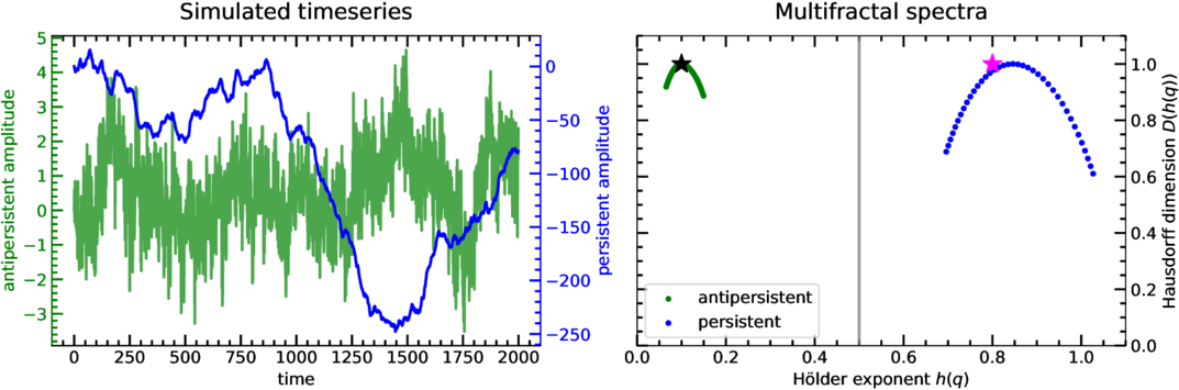 The MFDFA technique applied to two simulated time series. The time and amplitude values are in arbitrary units. The green data is antipersistent, akin to Poisson noise present in X-ray detectors, and is defined as fractional Brownian motion (fBm) with a Hurst exponent H = 0.1 (B. B. Mandelbrot & J. W. V. Ness 1968). The blue data is a persistent time series, which is more akin to thermal X-ray emission, defined as fBm with H = 0.8. The stars on the right-hand plot indicate the ground truth time series Hurst exponents. An intuitive way to interpret the right-hand plot is as a probability density of different fractal behavior across the time series. The left-hand time series are snapshots of infinite processes; in the infinite-time limit, the multifractal spectra on the right would converge to the stars. The gray line indicates the persistence/antipersistence boundary h = 0.5.