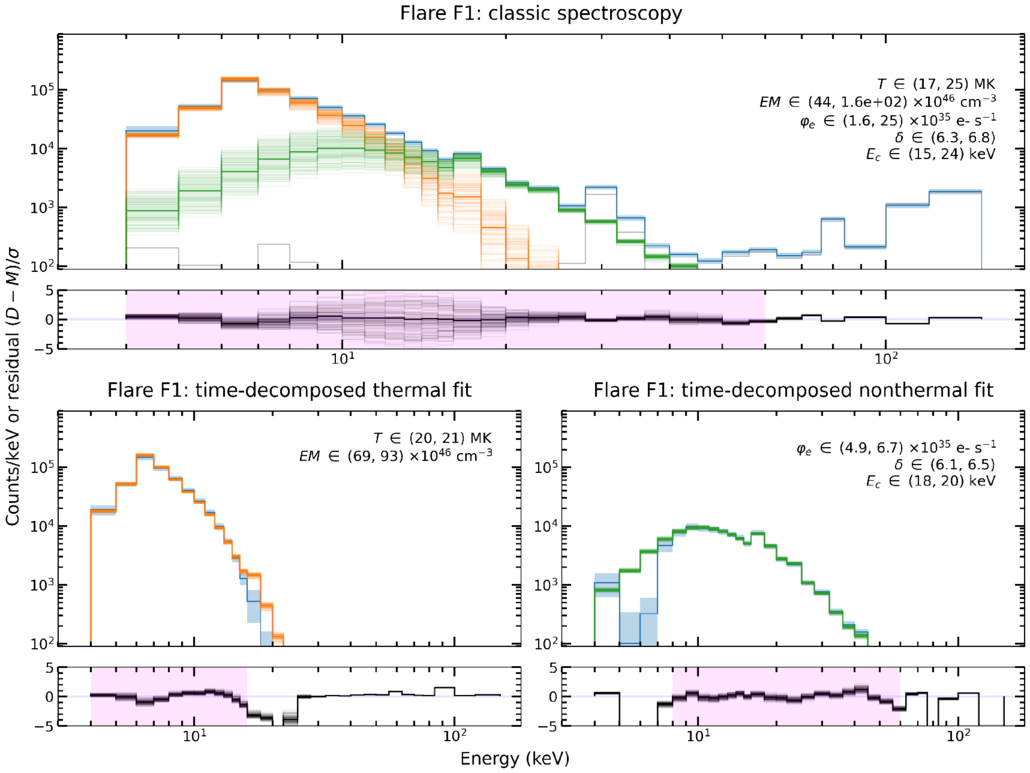 Comparison of traditional versus time-decomposed spectroscopy for Flare F1 (M1 class 2022 Apr 20). The blue lines are the data, orange lines are the thermal bremsstrahlung fits, and green lines are the cold thick-target fits. The pink regions in the residual plots indicate the energy fitting ranges. The top panel shows traditional spectroscopy, and the bottom two panels show the results from the time-decomposed fits. The plots are annotated with 95% χ2 parameter intervals. We restrict the fit to regions where the decomposed spectrum is ≥5% of the total spectrum, and where the error bars are ≤50% of the mean value.