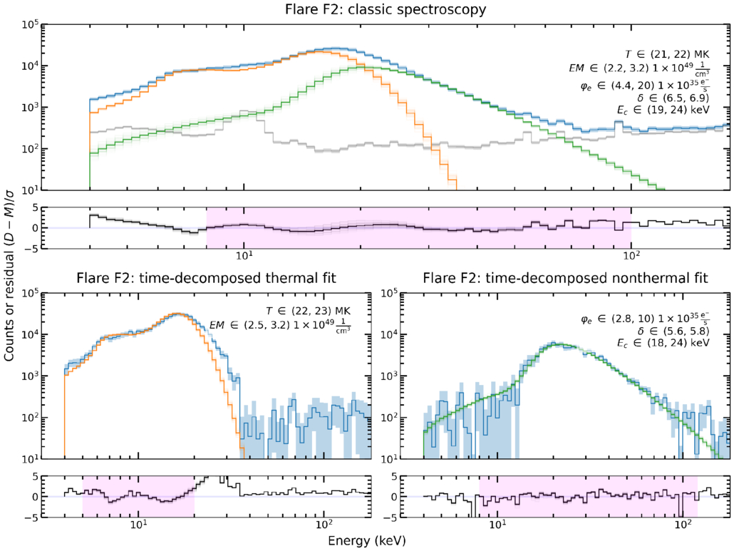 Comparison of traditional versus time-decomposed spectroscopy for Flare F2 (M9 class, 2011 July 30). The blue lines are the data, orange lines are the thermal bremsstrahlung fits, and green lines are the cold thick-target fits. The pink regions in the residual plots indicate the energy fitting ranges. The gray line in the first panel is the background. The top panel shows traditional spectroscopy, and the bottom two panels show the results from the time-decomposed fits. The plots are annotated with 95% χ2 parameter intervals. There are many MCMC samples overplotted to give a sense of model variation. The spurious counts in the thermal decomposition at high energies are nonphysical and are not included in the fit range. They arise because the background is slowly varying across time, like the thermal component.