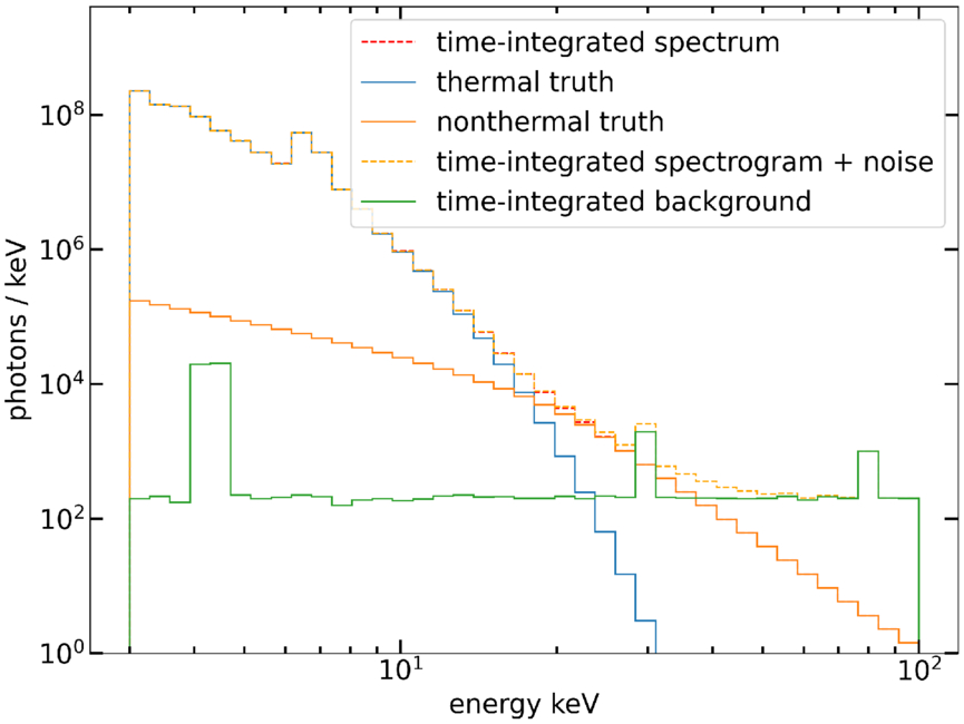 Simulated, time-integrated flare spectrum for the typical solar flare. The “truth” components show the individual thermal/nonthermal photon spectra. The dashed red line shows the composite spectrum without background, and the dashed orange one shows it with background.