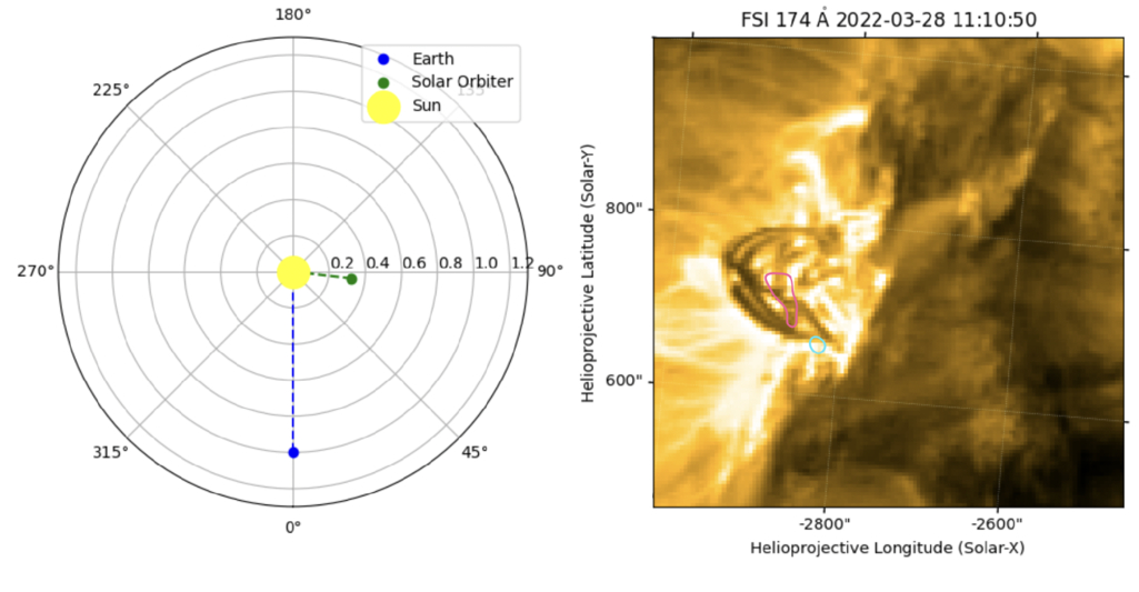 Left: SolO/STIX location during Flare 3 with respect to Earth and the Sun. The angle of separation between SolO and Earth was 83﹩\mathop{.}\limits^{\unicode{x000b0}}﹩4 at the time of observation. Right: FSI/SolO 174Å image of Flare 3.