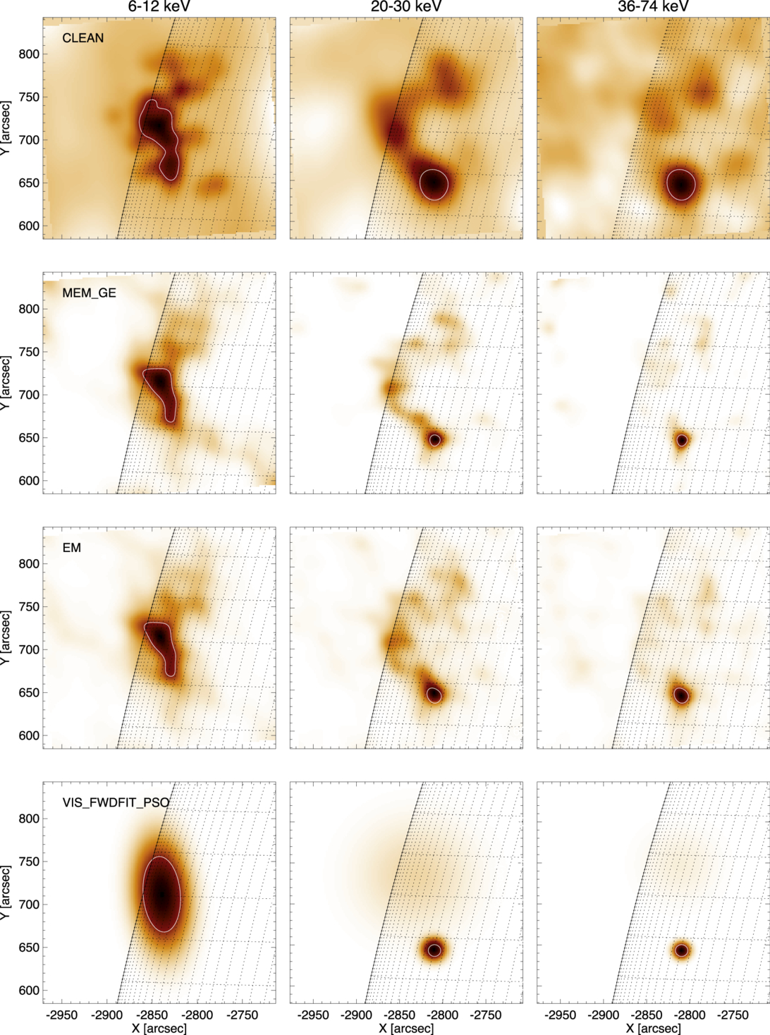 Flare 3, STIX imaging. Columns left to right: STIX 6–12 keV, 20–30 keV, and 36–74 keV images. Rows show different imaging algorithms, top to bottom: CLEAN (CLEAN beamwidth = 2.0), MEM_GE, EM, and VIS_FWDFIT_PSO. Column 1 shows a white contour of the looptop, defined as the 50% contour of the 6–12 keV emission. The white contours in Columns 2 and 3 highlight footpoints, defined as the 50% contour of the 36–74 keV emission.