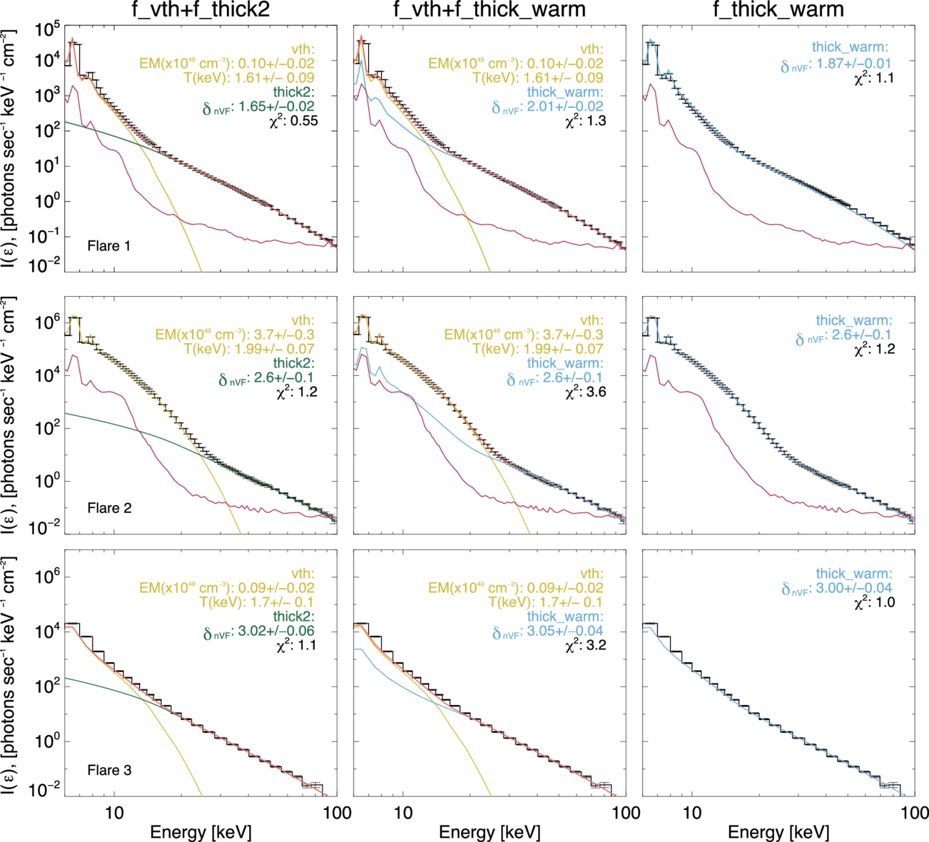 A comparison of spectral fittings for each flare. The left, middle, and right columns show spectral fittings when using f_vth+f_thick2, f_vth+f_thick_warm, and f_thick_warm, respectively.