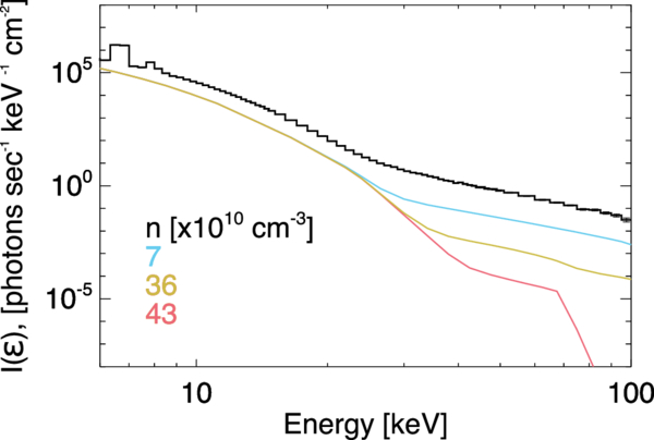 Observed photon flux spectrum of Flare 2 (black) compared to the simulated photon flux spectrum (blue) for simulations using n = 7 × 1010, 36 × 1010, and 43 × 1010 cm−3, shown by the blue, yellow, and pink curves, respectively.