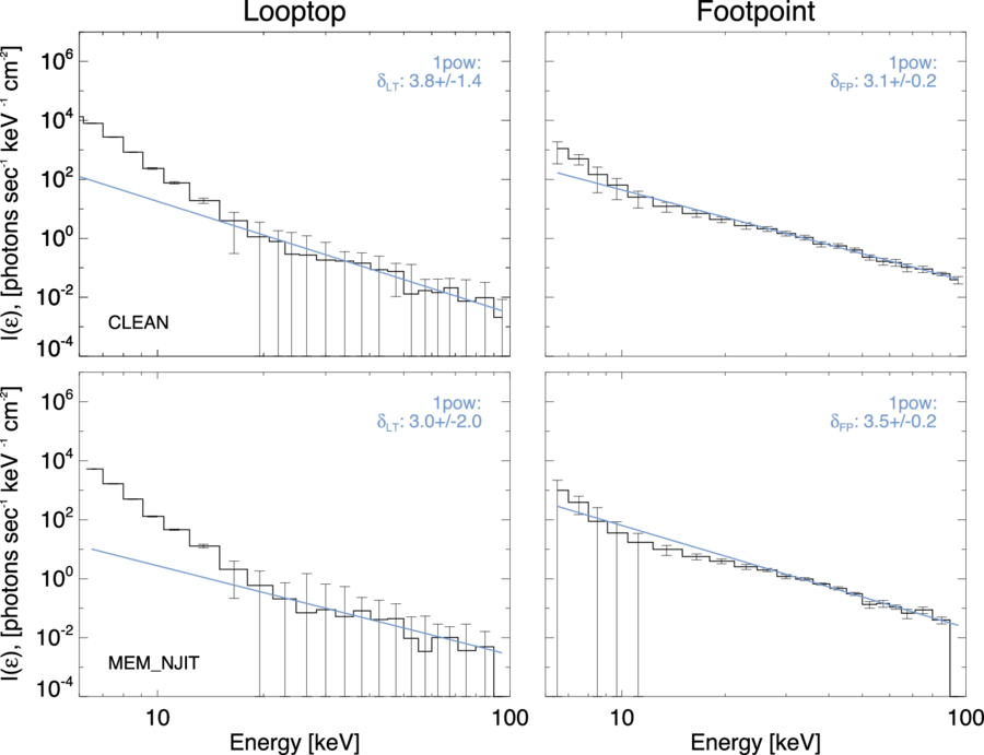 Spatially resolved photon energy spectra for Flare 1 in the coronal looptop (left column) and the chromospheric footpoint (right column), created using the CLEAN (top row) and MEM_NJIT (bottom row) imaging algorithms.