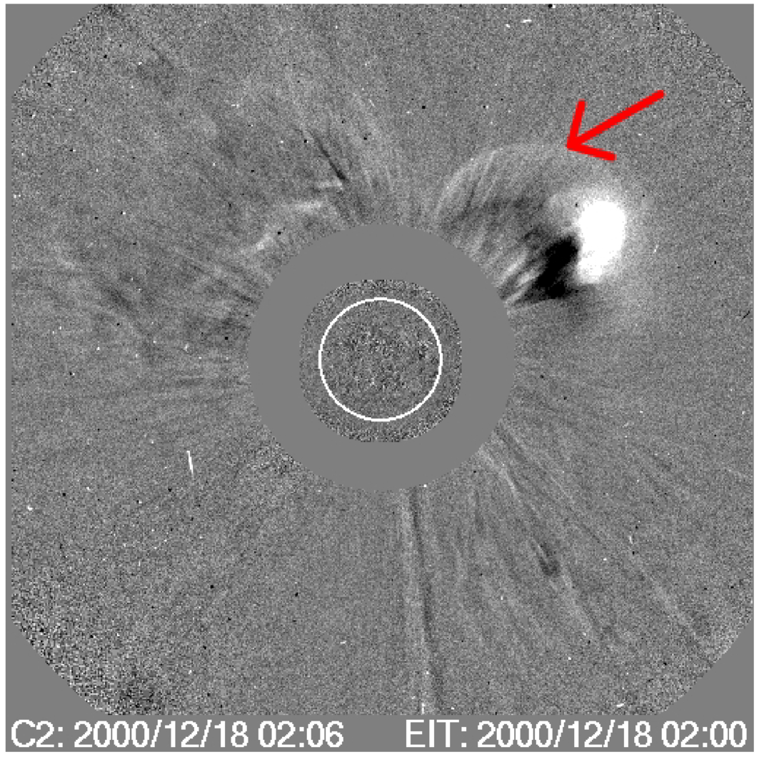 The CME and its driven shock from the SOHO LASCO/C2 instruments on 2000 December 18. The red arrow denotes the shock.