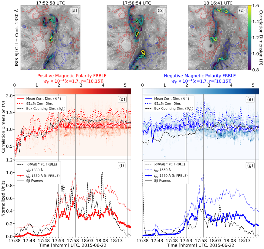 Evolution of FRBLE complexity and reconnection proxies. (a)–(c) Example frames (same as Figures 2(a5), (b5), and (c5)) showing ﹩{ \mathcal D }﹩ along the FRBLE at 17:52, 17:58, and 18:16 UT. Contours show HMI Bz levels: +500/+1000 G (red), −500/ − 1000 G (blue), and 0 G (white). (d) and (e) Distributions ﹩{w}_{{ \mathcal D }}﹩ for the positive and negative polarity ribbons. Solid lines show the mean ﹩\bar{{ \mathcal D }}﹩, dotted lines show the 95th percentile, and black dashed lines show the box-counting dimension ﹩{{ \mathcal D }}_{{{\rm{BC}}}}﹩. (f) and (g) Time series reconnection dynamics proxies in positive and negative magnetic polarity FRBLEs, respectively. The solid and dashed colored lines (red and blue) represent the 1330 Å intensity emitted from the FRBLE and full SJI FOV, respectively, while the black dashed line shows the cumulative reconnection rate derived from FRBLE observations. Vertical gray lines mark the times in (a)–(c).