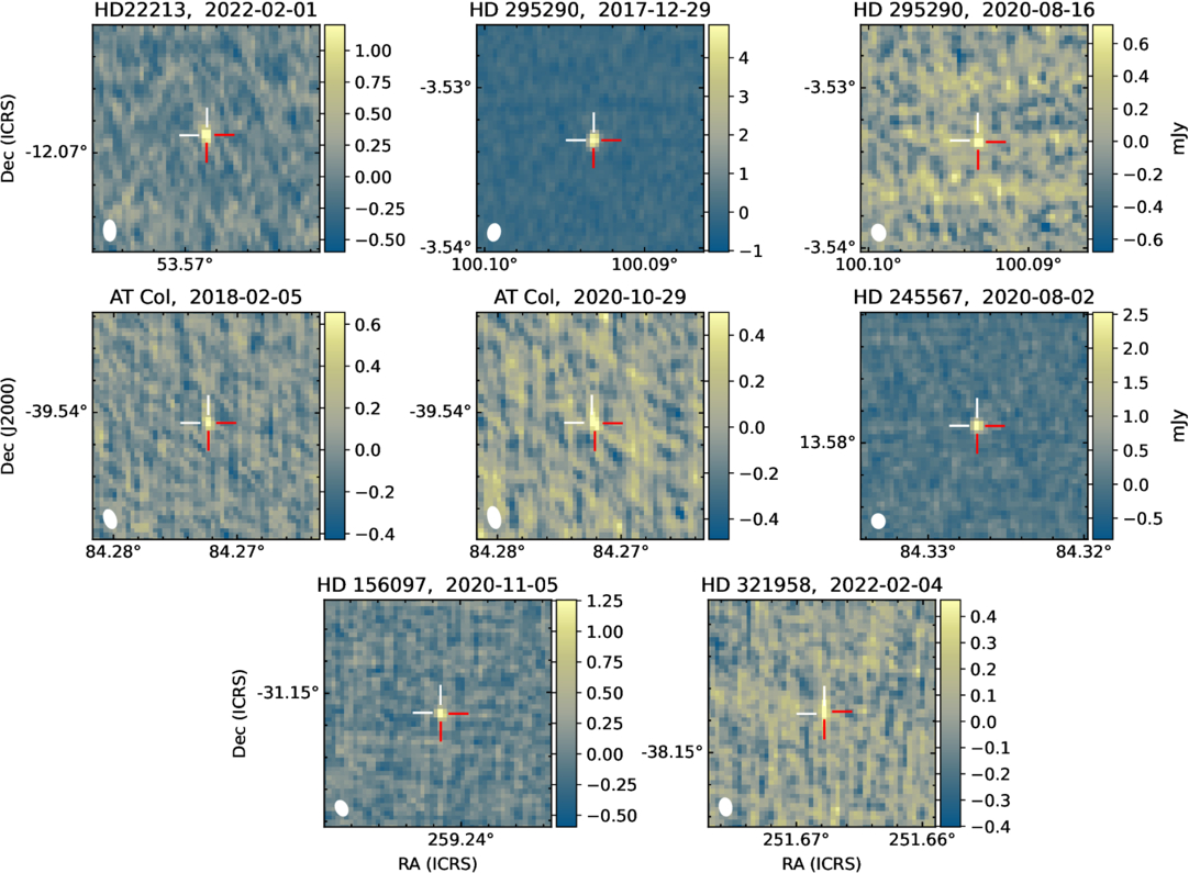 The CIRADA Stokes I cutout for each VLASS source associated with a superflaring star. The white crosshairs are centered on the proper-motion-corrected position of the star from SIMBAD values (M. Wenger et al. 2000), and the red crosshairs are centered on the position of the source as identified by CASA’s imfit function. The beam shape is shown as a white ellipse in the bottom-left corner of each frame.