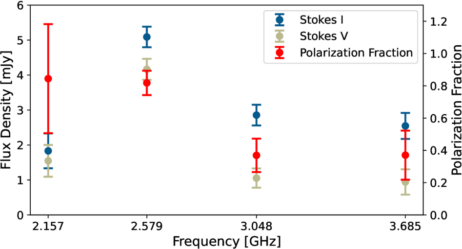 The spectra of Stokes I and V (left axis) and the polarization fraction (right axis) for HD 245567 in VLASS E2. At the peak flux density, the polarization fraction is 0.82 ± 0.076. The error bars here represent ±1σ uncertainties, with the polarization fraction uncertainty calculated using standard error propagation for Sν,V/Sν,I. The frequencies here were selected to have a constant fractional bandwidth νhi/νlow = (4013 MHz/1965 MHz)1/4 = 1.1954, where νhi is the high end of the subband, νlow is the low end, and 1965–4013 MHz is the full VLASS frequency range.
