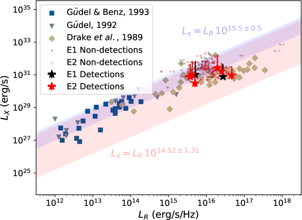 Estimated LX plotted against LR for the six VLASS-detected superflaring stars, along with three other populations of stars. The vertical error bars span the peak luminosities for the brightest and dimmest flares for each star, and the horizontal error bars represent the noise in the corresponding CIRADA frame. The minimum required radio luminosity for a 4σ detection vs. the estimated X-ray luminosity for each of the 144 other TESS superflaring stars are also included as points. The Güdel–Benz relation from M. Gudel et al. (1993) is shown in red and the relation from A. O. Benz & M. Guedel (1994) is shown in blue.
