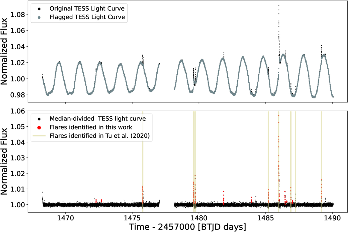 The original SPOC light curve and the light curve with masked outlying points for HD 295290 (top) and the corresponding detrended light curve with the identified flares (bottom). Because Z.-L. Tu et al. (2020) provided the times for the flares they identified, the peak times of their flares are also included in the bottom plot. Our flare-identification framework identified 14 flares for HD 295290 compared to Z.-L. Tu et al.’s (2020) eight flares and L. Doyle et al.’s (2020) 16 flares. Many of the flares we detected that were not reported by Z.-L. Tu et al. (2020) may have been excluded from their analysis because they did not qualify as superflares based on their energy calculations.
