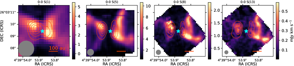 Continuum-subtracted moment 0 maps for a sample of our detected molecular hydrogen transitions, with contours representing the local continuum.