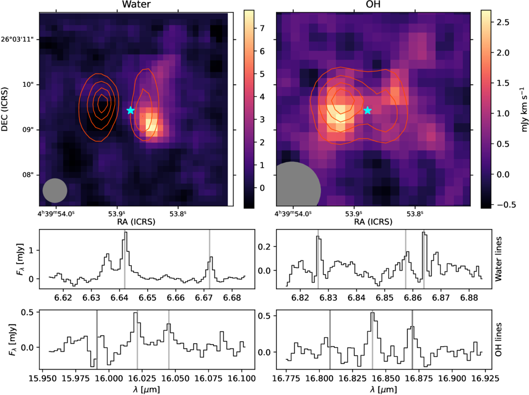 Stacked moment 0 maps for water (left) and OH (right). The contours represent the 16.0 μm continuum (for OH), and the 6.6 μm continuum (for water). The top row of spectra show the detected water lines, and the bottom row of spectra show the detected OH lines.