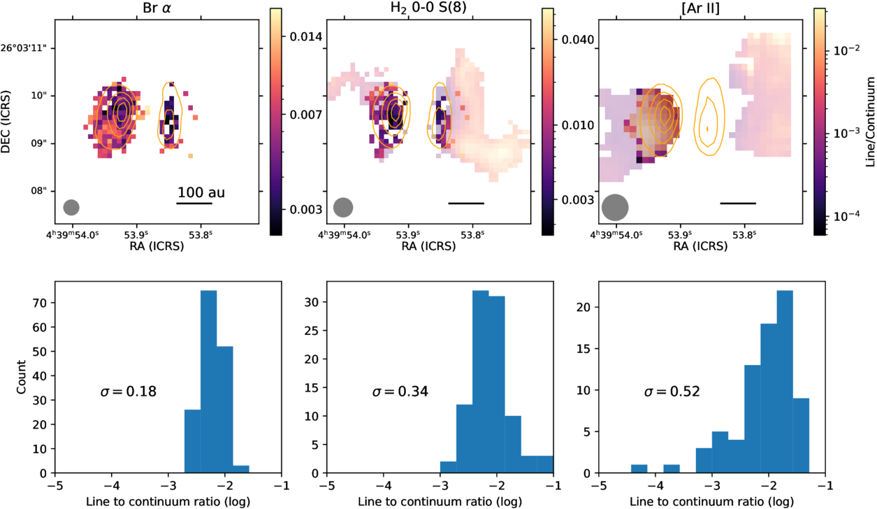 Top: line-to-continuum ratio maps for Brα, H2 0-0 S(8), and [Ar II]. We have masked out the regions where the line emission is below the 1σ threshold. Additionally, we emphasize the inner region of the map where the Brα emission is present by making regions outside of this fainter. The contours represent the local continuum. Bottom: histograms of the line-to-continuum ratio maps along with the standard deviation. These histograms are generated from only the compact emission, where Brα is present, to better compare the different species on the same spatial scales. These maps and histograms show that the line-to-continuum ratio is more constant for Brα compared to H2 and [Ar II], supporting the interpretation that the Brα is likely being observed in scattered light.