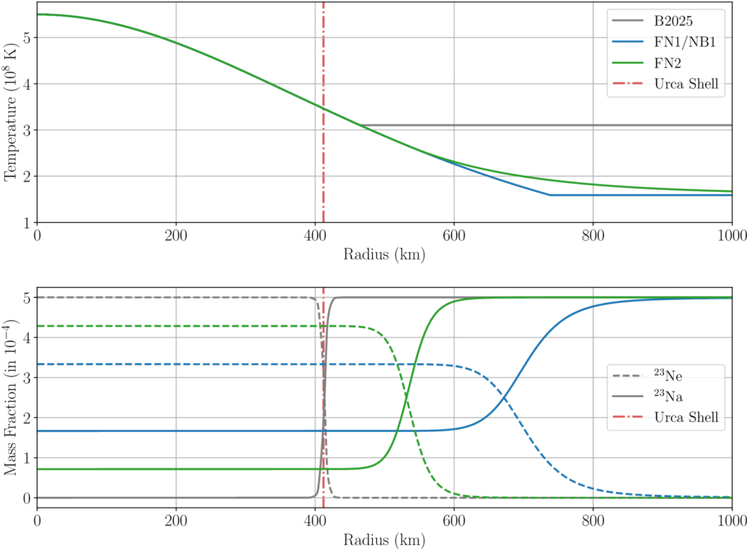 Top plot: star temperature vs. radius profiles. Bottom plot: mass fraction of the Urca species vs. radius. The gray curves represent the initial state of the simulations in B2025, the blue curves the initial state of the FN1 and NB1 simulations, and the green curves the initial state of the FN2 simulation. The dashed curves represent the 23Ne and the solid ones the 23Na. The vertical red line indicates the position of the Urca shell.