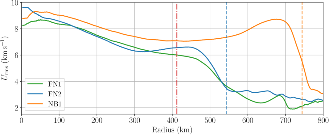 Urms(r) against radius profiles averaged over time. That is the last 400 s for the FN1 simulation (represented by the green curve), 400 s for the FN2 simulation (represented by the blue curve), and the last 500 s for the NB1 simulation (represented by the orange curve). The vertical dashed lines indicate the Rconv for the FN2 (blue) and NB1 (orange) simulations. The red vertical dashed–dotted line indicates the location of the Urca Shell.
