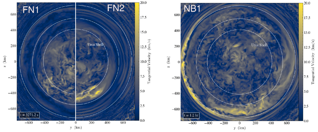 Slices through the center of the WD, zoomed into the convective core region. From left to right, we have the FN1, FN2, and NB1 simulations. The inner white circle indicates the Urca shell. The outer two circles approximately mark the edge of the convection zones for the two simulations, 545 and 745 km, respectively.