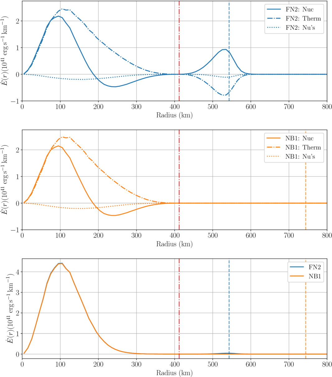 Top plot: energy generation rate components per radial bin in the FN2 simulation. Middle plot: energy generation rate components per radial bin in the NB1 simulation. Bottom plot: Total energy generation rate per radial bin with all the contributions summed up. The blue lines represent the FN1 simulation, the orange lines the NB2, and the vertical lines indicate the convective boundaries.