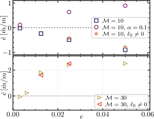 The rate of change of binary eccentricity for nearly circular binaries. The top panel plots the results for ﹩{ \mathcal M }=10﹩ disks and the bottom for ﹩{ \mathcal M }=30﹩ disks. Squares in the top panel and right-pointing triangles in the bottom panel plot the results using our fiducial viscosity (constant ν) and ℓ0 = 0 in Equation (19). Stars in the top panel and left-pointing triangles plot results with ℓ chosen to initiate each disk with its quasi-steady surface density profile (the value of ﹩\dot{J}/\dot{M}﹩ measured from an initial ℓ = 0 run; see the Appendix); whether or not each disk reaches a quasi-steady state is effectively irrelevant for ﹩\dot{e}﹩ near e ∼ 0, and seems to have no bearing on whether or not near-circular binaries are driven toward higher or lower eccentricities. In the top panel, circles plot the results from a pair of simulations using an ﹩\alpha =0.1﹩ viscosity; at ﹩{ \mathcal M }=10﹩, then, the viscosity prescription employed appears to determine the sign of ﹩\dot{e}﹩ at low but nonzero binary eccentricities. Unlike thicker disks, even with constant-ν viscosities, thin disks drive near-circular binaries to higher eccentricities.