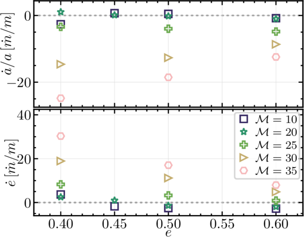 The rates of change of binary semimajor axes and eccentricities for different disk Mach numbers, holding ﹩\nu ={10}^{-3}﹩ constant. Rates of eccentricity excitation and putative equilibrium eccentricities appear to increase monotonically for ﹩{ \mathcal M }\,\geqslant \,20﹩.