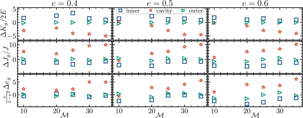 The change in binary energy, angular momentum, and eccentricity due to interactions with various regions of the disk. Blue squares plot contributions from the vicinity of the minidisks, orange stars plot contributions from within the cavity, and green triangles plot contributions from the circumbinary disk itself (see the final two paragraphs of Section 3.2.1 for details).