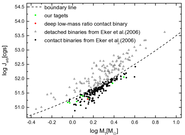 The relation between MT and Jorb. Triangles and black dots represent detached binary stars and contact binary stars from Z. Eker et al. (2006), green dots denote our target contact binary stars, the red dots indicate deep low-mass ratio contact binary stars, and the dashed line represents the boundary between detached binary stars and contact binary stars from Z. Eker et al. (2006).