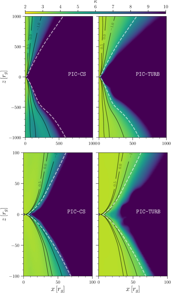 Top panels: Time and azimuthally averaged distributions of the power-law index κ for accretion simulations onto a rotating BH with dimensionless spin a⋆ = 0.9375. The left panel refers to the PIC-CS kappa model derived from Harris current sheets (Equation (11)), while the right panel exhibits the distribution for the PIC-TURB derived from decaying plasma turbulence (Equation (12)). Bottom panels: The same as on the top but shown on a smaller scale near the event horizon. Despite the similarity in the functional dependence, the two models for the power-law index κ can lead to differences, especially in the jet width (see also Figure 2). The black solid lines represent the separation between the jet spine and jet sheath and are defined by ﹩{\mathrm{log}}_{10}\sigma =\{-1,\,0,\,0.5\}﹩; the dashed white line refers instead to the Bernoulli parameter Be = 1.02 and separates the bound and unbound plasma, thus marking the external surface of the jet.