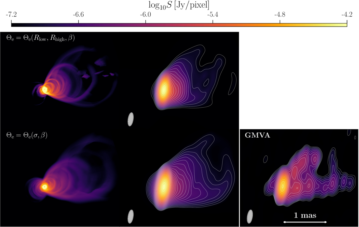 Best-fit models for the jet morphology of M87* as obtained from the most recent GMVA observations at 86 GHz (J. Y. Kim et al. 2018) (bottom-right panel). The left and middle columns refer to data that is azimuthally and time averaged over the interval 13,000–15,000, M, for a BH with dimensionless spin a⋆ = 0.9375. The top-left panel refers to the best-fit phenomenological model for the electron temperature, Θe = Θe(Rlow, Rhigh, β), corresponding to Rlow = 1 and Rhigh = 160, and a κ-distribution from a current sheet with parameters ϵ = 0.5, σcut = 3.0, rinj = 10 M. The bottom-left panel shows instead the best-fit model using the self-consistent electron temperature, Θe = Θe(σ, β), and a κ-distribution derived from a turbulent scenario. In this case, with ϵ = 1.0, σcut = 3, rinj = 10 M. The middle column displays the GRRT synthetic image convolved with a GMVA-like beam of 116 μas × 307 μas, to mimic the observational resolution.