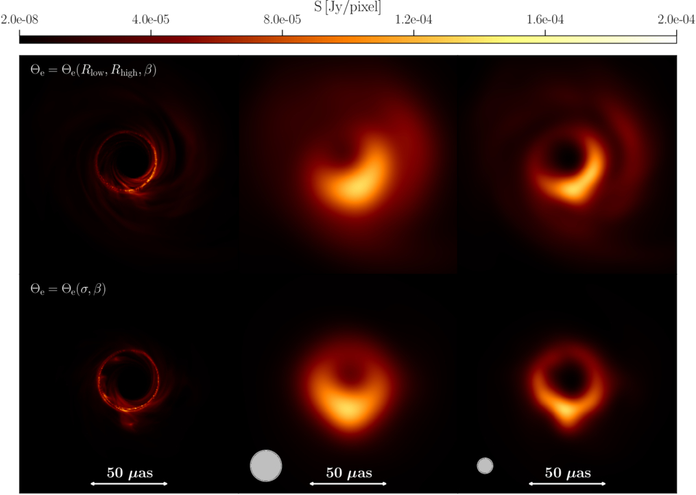 GRRT (left panels) and convolved images (middle and right panels) for our best-fit models, using either the phenomenological prescription Θe = Θe(Rlow, Rhigh, β) (first row) or the self-consistent prescription Θe = Θe(σ, β) (bottom row). The panels in the central column correspond to synthetic images at 230 GHz convolved with a beam with radius of 20 μas, mimicking the observational resolution for M87*, while in the right column, are reported the images at 345 GHz, with a smaller beam of 10 μas.