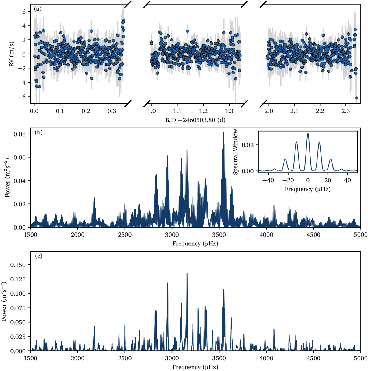 RV observations of HR 7672A over 3 consecutive nights using the KPF. (a) RV time series after filtering out signals with periods longer than 1.2 hr. (b) Power spectrum of the RV time series, weighted by the reported RV uncertainties, displaying a clear power excess around 3000 μHz. The inset shows the spectral window. (c) Power spectrum after deconvolution against the spectral window, followed by reconvolution with a Gaussian filter of width 1/Tobs for clarity.