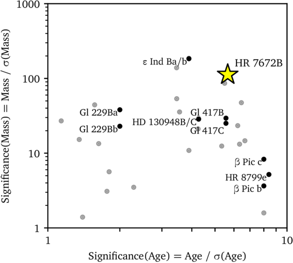 Summary of all known substellar companions with dynamical masses, plotting the significance of their measured dynamical masses and host star ages, defined as the ratio between the measured value and its uncertainty (Table 8). HR 7672B’s high precision in both quantities (0.9% in mass and 18% in age) makes it an exceptional benchmark for testing brown dwarf evolutionary models.